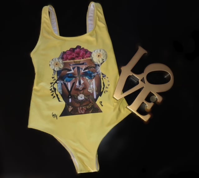 The design features mixed media original art, "Nachami" from the Scat Art Collection by Natasha Jane. Nachami is a Queen of Queens reflecting love, grace and wisdom of the ages! Think of this swimsuit as more than something worn, but a reminder of strength and inner magic!